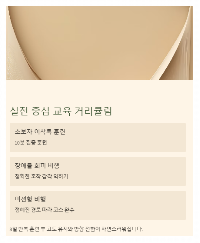 저는 처음에 이착륙도 제대로 못 해서 부끄러웠는데, 3일 정도 반복 훈련 후부터는 고도 유지와 방향 전환이 자연스러워졌습니다. 중요한 건 속도가 아니라 정확한 조작 감각을 익히는 것이라는 걸 몸으로 느꼈죠.