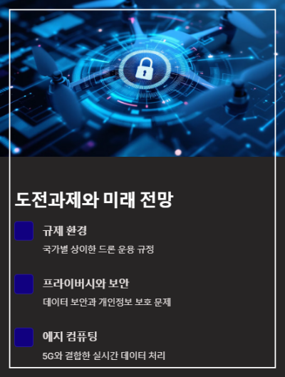 드론이 수집하는 데이터의 보안과 개인정보 보호에 대한 엄격한 프로토콜이 필요합니다. 미래에는 에지 컴퓨팅과 5G 네트워크의 결합으로 드론의 실시간 데이터 처리 능력이 더욱 향상될 것으로 예상됩니다.
