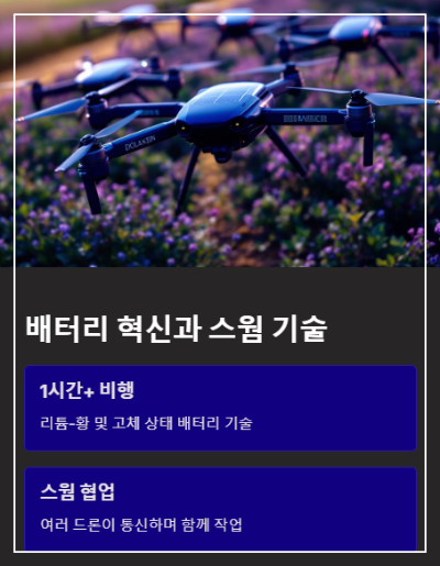 - 스웜 기술과 드론 협업 시스템 여러 대의 드론이 서로 통신하며 협업하는 스웜(swarm) 기술이 주목받고 있습니다. 농업 분야에서는 수십 대의 드론이 함께 작물 상태를 분석하고 정밀 관리를 수행하며, 건설 현장에서는 드론이 협력하여 구조물의 상태를 모니터링하고 3D 모델링을 생성합니다.