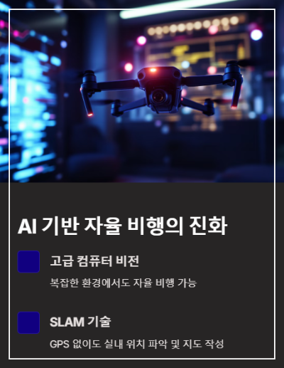 - AI 기반 자율 비행 시스템의 고도화 과거에는 조종사의 숙련도에 의존하던 드론이 이제는 고급 컴퓨터 비전과 머신러닝 알고리즘을 통해 복잡한 환경에서도 자율적으로 비행 경로를 계획하고 장애물을 회피할 수 있습니다. 특히 SLAM(Simultaneous Localization and Mapping) 기술을 활용하여 GPS가 작동하지 않는 실내 환경에서도 정확한 위치 파악과 지도 작성을 동시에 수행할 수 있습니다.
