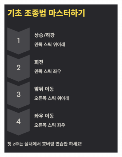 Tip! 첫 2주는 실내에서 ‘호버링(제자리비행)’ 연습만 해도 충분합니다. 성급하게 야외로 나가면 나무에 박고 눈물 납니다... (경험자 인증)