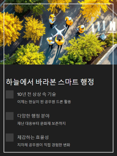 공무원이 드론을 조종해 재난 현장을 살피고, 환경을 감시하며, 문화재를 보존하는 모습이 더 이상 낯설지 않습니다. 저 역시 지방자치단체 공무원으로 일하며, 드론 활용 행정의 진가를 몸소 체감하고 있습니다.
