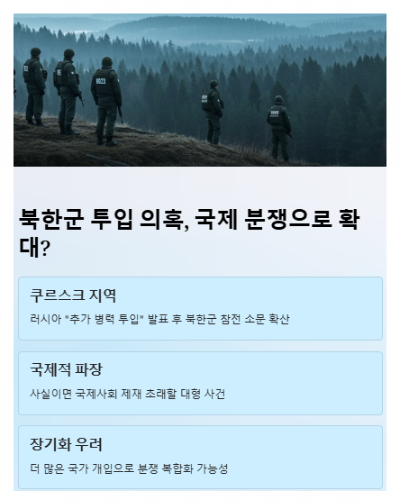 북한군투입: 사실 여부가 완전히 확인되진 않았으나, 만약 실현됐다면 전쟁이 다자화될 공산이 커진다. 국제제재와 정치적 후폭풍이 예상된다.