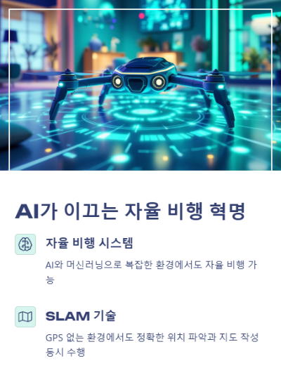 1. AI 기반 자율 비행 시스템 과거에는 조종사의 능력에 크게 의존하던 드론이 이제는 AI와 머신러닝 알고리즘을 통해 복잡한 환경에서도 자율적으로 비행 경로를 계획하고 장애물을 회피할 수 있습니다. 예를 들어, Shield AI의 'Nova' 드론은 GPS가 작동하지 않는 실내 환경에서도 SLAM(Simultaneous Localization and Mapping) 기술을 활용해 정확한 위치 파악과 지도 작성을 동시에 수행합니다.