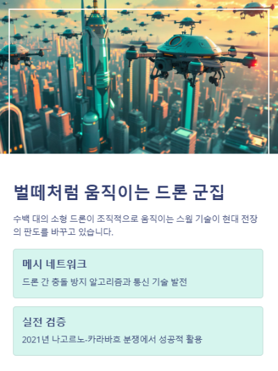 3. 드론 군집 작전(Swarm Technology) 수십, 수백 대의 소형 드론이 마치 벌떼처럼 조직적으로 움직이며 임무를 수행하는 드론 스웜 기술은 현대 전장에서 주목받고 있습니다. 이 기술은 2021년 나고르노-카라바흐 분쟁에서 아제르바이잔이 성공적으로 활용하면서 전 세계 군사 전문가들의 관심을 끌었습니다. AI와 통신 기술의 발전으로 드론 간 충돌을 방지하는 알고리즘과 메시 네트워크 통신 기술이 발전하면서, 수백 대의 드론이 조화롭게 작업할 수 있게 되었습니다.