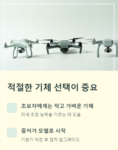 높은 스펙 기체는 기능이 많아 오히려 헷갈릴 수 있으니, 적절한 중저가 모델로 조종스킬을 익히다가 점차 업그레이드하는 방식이 무난합니다.