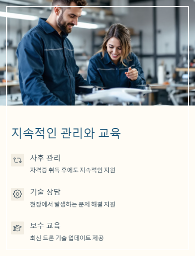 대부분의 학원이 자격증 취득 후 관리가 소홀한 것과 달리 구구드론은 지속적인 사후 관리와 보수교육을 통해 수강생을 끝까지 책임집니다.