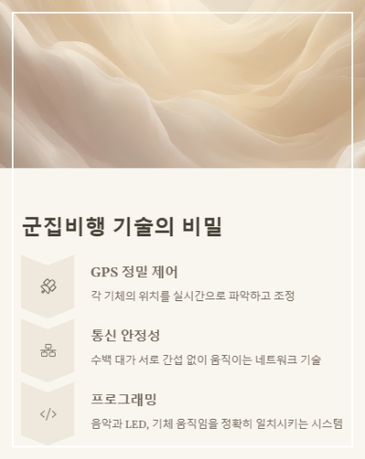 하나의 드론을 비행하는 것도 쉽지 않은데, 어떻게 수백 대를 동시에 띄워서 조종할 수 있을까요? 사실 핵심은 군집비행 알고리즘입니다. 각 기체에 장착된 GPS와 자이로 센서, 그리고 중앙 통제 시스템이 긴밀히 협업해 충돌 없이 자리를 잡아주는 거예요.