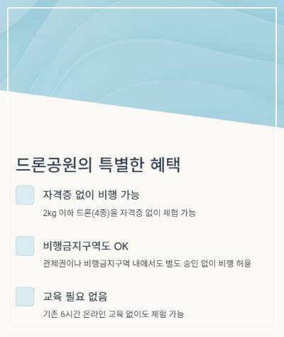 기존엔 250g만 넘어도 자격증이 필수였지만, 이제는 드론공원에서 2kg 이하 드론(4종)을 자격증 없이 체험 가능!