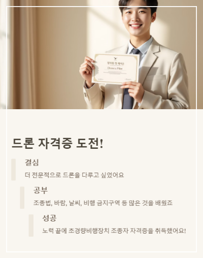 처음엔 단순히 취미였지만, 드론이 얼마나 다양하게 활용되는지 알게 되면서 제 꿈도 점점 커졌어요.