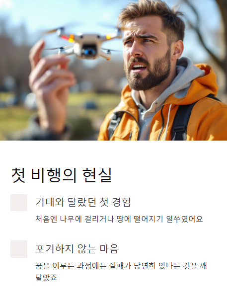 처음 드론을 만났던 날은 생생히 기억나요. 작은 상자 속에 들어있던 드론은 마치 제가 오랫동안 기다려온 보물 같았어요. 처음 드론을 하늘로 날릴 땐 너무 떨려서 손이 덜덜 떨렸죠. 그런데 기대와는 달리 드론은 생각만큼 멋지게 날지 않았어요.