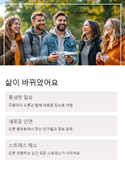 가족들도 드론 덕분에 다양한 곳으로 함께 여행하면서 즐거운 추억을 만들었어요. 또 드론이라는 공통된 관심사로 친구들도 많이 생겼답니다. 드론 동호회에서 만난 친구들과 정보를 나누고, 비행 연습을 하면서 많은 것을 배울 수 있었어요.