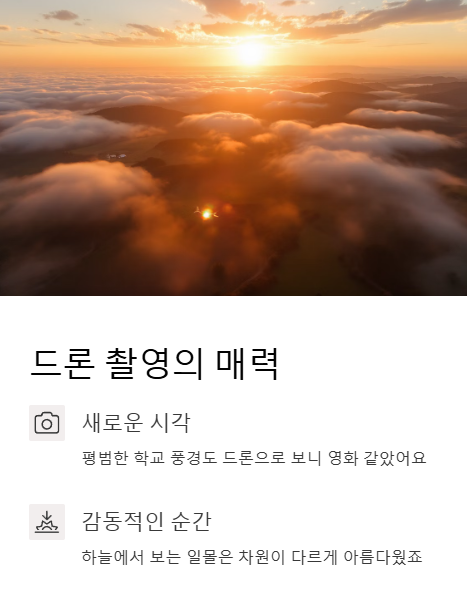 처음 드론으로 찍은 영상은 학교 운동장이었어요. 평범했던 학교 풍경이 드론의 시점으로 보니 전혀 다른 모습으로 다가왔죠. 학교 건물과 운동장은 마치 영화 속 장면처럼 멋지게 나타났어요. 그때부터 저는 드론 촬영에 푹 빠졌답니다.