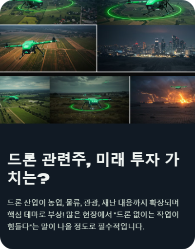 최근 드론(무인항공기) 산업이 빠르게 확장되면서, 주식시장에서도 드론관련주가 핵심 테마로 부상했습니다.