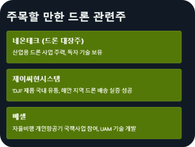 드론 규제 완화나, 국책사업(방산·UAM 지원) 발표에 따라 해당 종목이 수혜를 볼 수 있음.