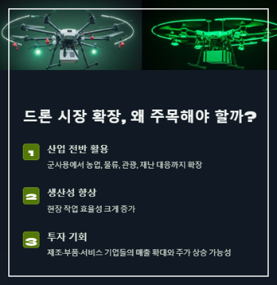 이는 결과적으로 드론 제조·부품·서비스 기업들의 매출 확대와 더불어 주가 상승 가능성으로 이어질 수 있죠.