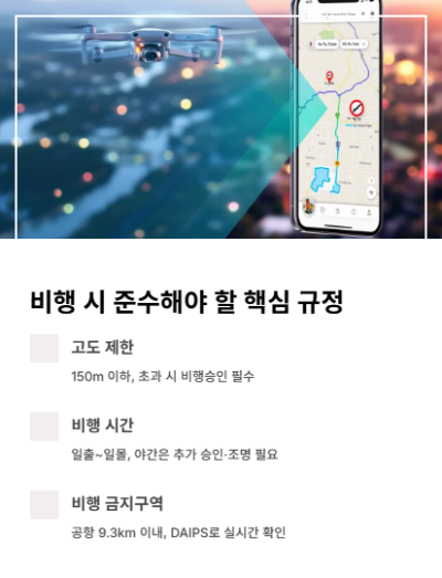 항목기준메모고도150 m 이하초과 시 비행승인 필수시간일출~일몰야간 촬영은 추가 승인·조명 장착구역공항 9.3 km 이내 금지DAIPS 확인