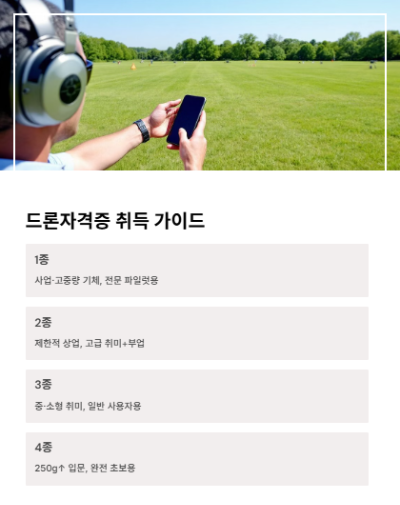 등급운용 범위추천 대상1종사업·고중량 기체전문 파일럿2종제한적 상업고급 취미 + 부업3종중·소형 취미일반 사용자 (필자 취득)4종250 g↑ 입문완전 초보