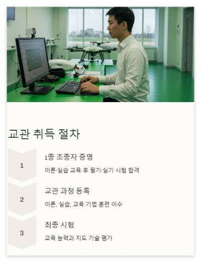 교관이 되려면 1종 자격증이 필수며, 그 후 교관 과정을 이수해 이론·실습 평가를 통과해야 합니다.