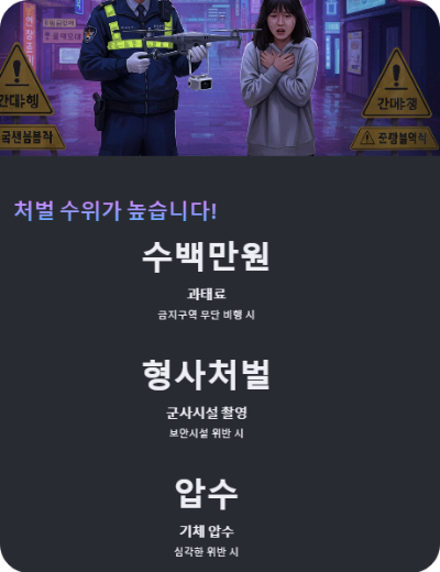 형사처벌: 군사시설 촬영, 보안시설 위반 등 중대한 사안이면 형사처벌까지 이어질 수 있습니다.