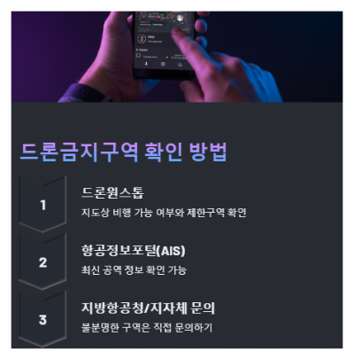 출발 전 공역 확인: 드론원스톱, 항공정보포털 등으로 비행 구역 상태 파악.