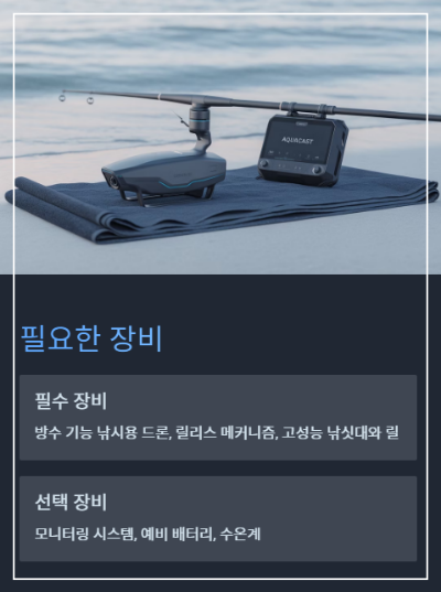 고성능 낚싯대와 릴: 일반 낚싯대보다 튼튼하고 긴 제품이 좋습니다. 드론으로 멀리 던진 미끼에 큰 물고기가 걸릴 경우를 대비해야 합니다. 방수 카메라: 드론에 장착하여 물속을 관찰하거나 물고기의 움직임을 파악하는 데 활용합니다.