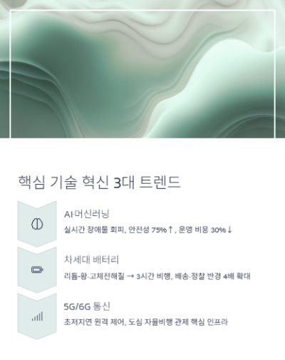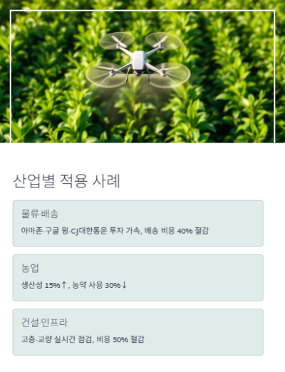 - 아마존·구글 윙·CJ대한통운 등 글로벌 기업이 배송드론 투자를 가속 → 배송 비용 40% 절감.