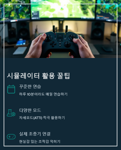 매일 꾸준히 연습하기: 하루 10분이라도 꾸준히 연습하면 실제 비행 실력이 빠르게 향상됩니다.