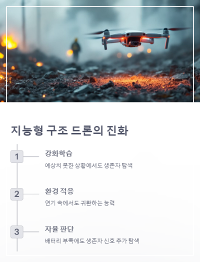 가장 인상 깊었던 순간은, 배터리 부족 경고에도 불구하고 생존자 신호를 포착한 뒤 추가로 탐색한 후 귀환했던 모습이었습니다. 이것이 바로 드론이 생명체처럼 스스로 '판단'하는 진화의 순간이 아닐까요?