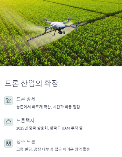 - 드론택시: 2025년 중국에서 시작될 드론택시 상용화는 상징적입니다. 한국에서도 도심 항공 모빌리티(UAM)에 적극 투자 중이며, 드론 기반 대중교통 시스템이 머지않아 현실화될 것입니다.