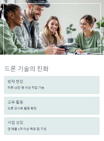 드론은 단지 하늘을 나는 기계가 아닙니다. 문제를 해결하는 도구이며, 새로운 직업과 삶의 방식을 만들어내는 혁신 수단입니다.