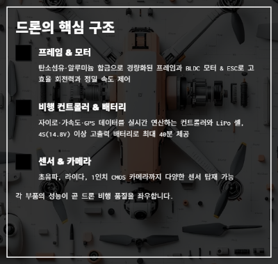 이처럼 핵심 부품의 조합으로 비행이 이뤄지며, 각 부품의 성능이 곧 드론 비행 품질을 좌우합니다.