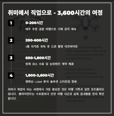 취미가 직업이 되는 과정에서 가장 중요한 것은 비행 기록 + 실전 포트폴리오였습니다. 클라이언트는 당신의 학원 수료증보다 안전 비행 시간과 실제 결과물을 먼저 확인하니까요.