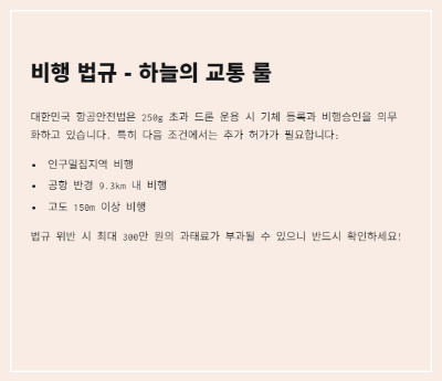 법규를 모르면 과태료가 최대 300만 원까지 부과될 수 있으니 드론의 세계를 안전하게 즐기기 위해선 반드시 확인해야 합니다.