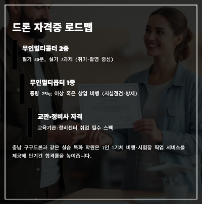 충남 구구드론과 같은 실습 특화 학원은 1인 1기체 비행·시험장 픽업 서비스를 제공해 단기간 합격률을 높여줍니다.
