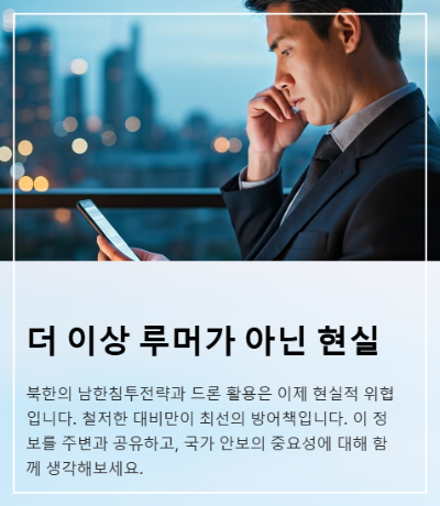 북한도 이를 간과하지 않았을 테니, 이제 한반도 군사 상황이 더욱 복합적으로 변할 것”이라고 말하더군요. 이제는 더 이상 황당무계한 소문으로 치부하지 말고, 가능성 있는 시나리오로 치밀하게 대비해야 할 시점입니다.