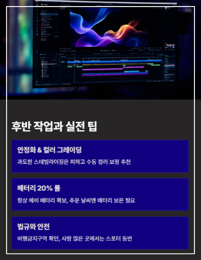 드론촬영의 핵심은 안정감입니다. 기본 조종 실력이 부족하면 아무리 좋은 기법도 무용지물입니다.