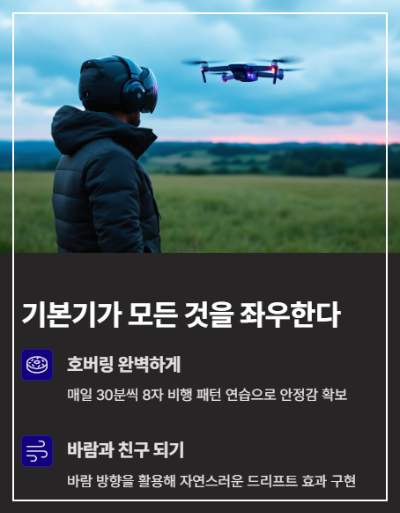 드론촬영의 핵심은 안정감입니다. 기본 조종 실력이 부족하면 아무리 좋은 기법도 무용지물입니다.