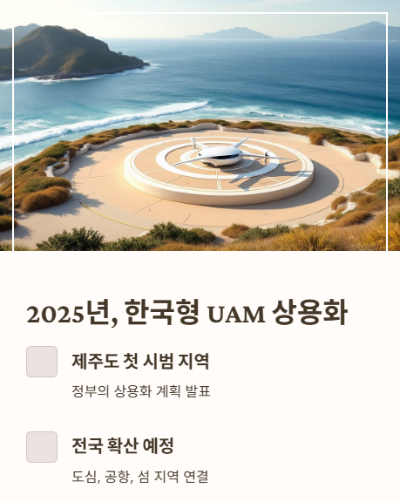 제주도가 첫 시범 지역으로 선정되었고, 이를 계기로 UAM 서비스가 전국으로 확산될 예정입니다.