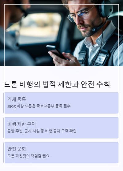 또한 비행 제한 구역(공항 주변, 군사 시설 등)과 비행 금지 구역을 반드시 확인해야 합니다. 안전한 비행 문화 정착을 위해 모든 파일럿들이 책임감을 가져야 한다고 생각합니다.