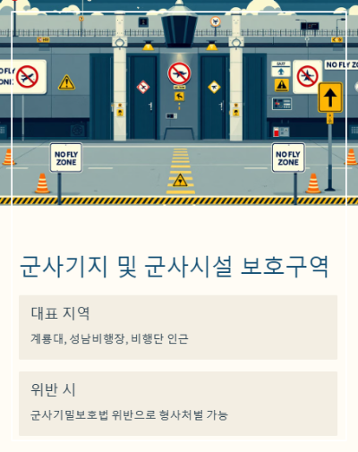 군사보안상 민간의 비행체 접근이 철저히 제한됩니다.대표적으로는 계룡대, 성남비행장, 비행단 인근 지역 등이 포함됩니다.