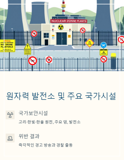 고리·한빛·한울 원전, 주요 댐, 발전소 등은 국가보안시설로 지정되어 있으며드론 비행 시 즉각적인 경고 방송과 경찰 출동이 이뤄집니다.