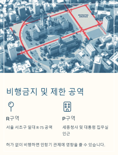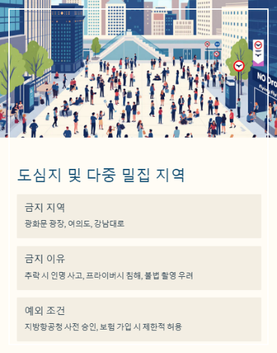 사람이 많이 모이는 지역이나 광화문 광장, 여의도, 강남대로 같은 중심가는드론 비행이 원칙적으로 금지됩니다.
