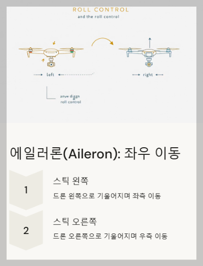 에일러론은 드론의 좌우 기울기(롤)를 담당합니다.
