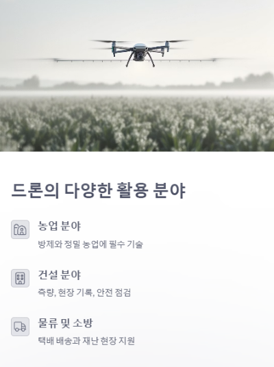 드론은 농업, 물류, 소방, 군사, 환경관리 등 사회 전반에 걸쳐 없어서는 안 될 필수 기술로 자리 잡고 있습니다.
