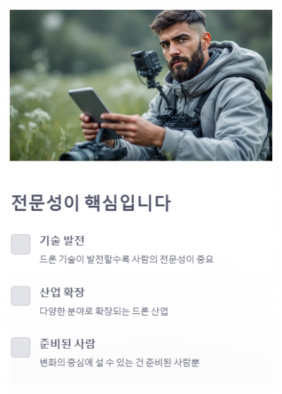 - 드론 장비 이해와 실무 능력은 실제 산업현장에서 큰 차이를 만듭니다. 단순 비행을 넘는 정비, 데이터 분석, 운용 노하우가 필요합니다.