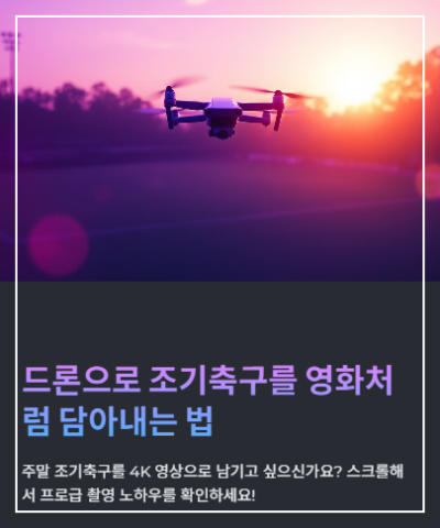 조기축구드론촬영 은 단순 기록을 넘어 팀워크와 열정을 담는 예술입니다. 오늘 소개한 드론촬영기법 과 스포츠드론 설정을 적용해, 여러분만의 영화 같은 축구하이라이트영상 을 완성해 보세요!