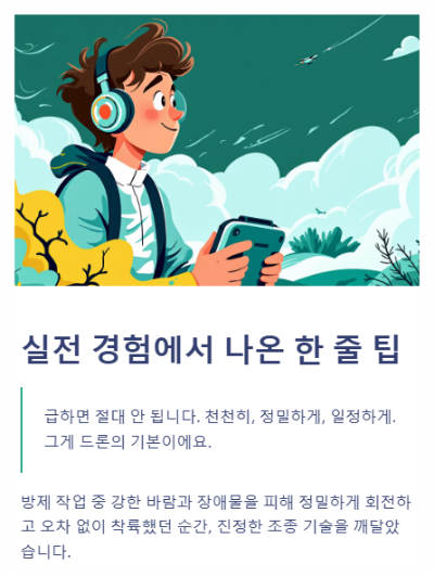실제 방제 작업 중 강한 바람과 장애물을 피해 정밀하게 회전했던 경험은 아직도 생생합니다. 수동 조종으로 방향을 바꾸고, 속도를 조절하며 오차 없이 착륙했던 그 순간, ‘이게 진짜 조종 기술이구나’ 했죠.