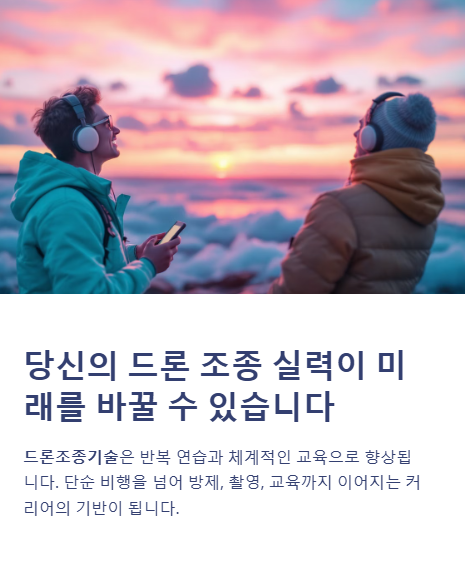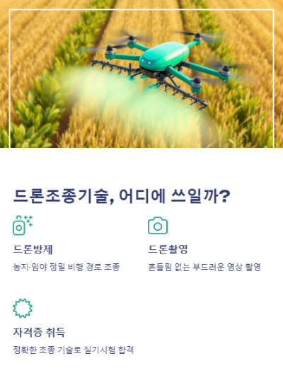 드론조종기술은 반복 연습과 체계적인 교육을 통해 향상됩니다. 단순한 비행을 넘어 드론방제, 드론촬영, 자격증, 교육강사로 이어지는 커리어의 기반이 되죠.지금 시작해 보세요. 당신의 조종 실력이 미래를 바꿀 수 있습니다.