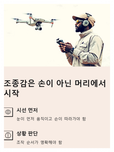 ✔ 눈이 먼저 움직이고 손이 따라가야 부드러운 비행이 가능합니다.